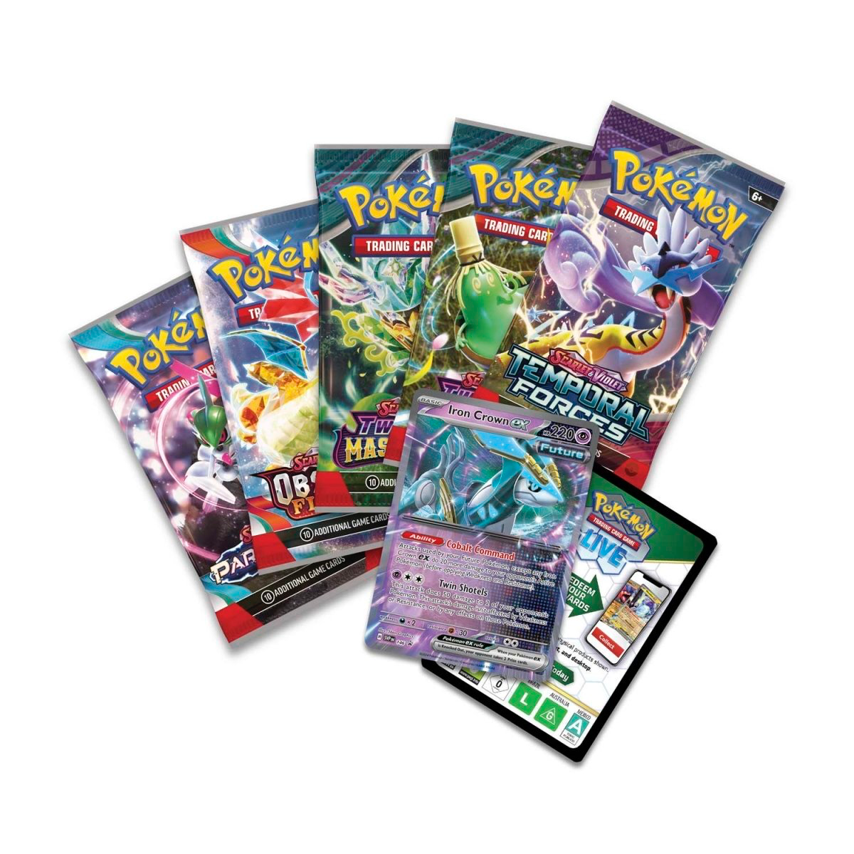 More Paradox Pokémon from the past and future arrive in the Pokémon TCG for a destined battle surpassing time itself! The Ancient Pokémon Gouging Fire ex and Raging Bolt ex show their primordial prowess, while the Future Pokémon Iron Boulder ex and Iron Crown ex demonstrate metallic mastery. In this Paradox Destinies Tin, you’ll find a promo card featuring one of these four Paradox Pokémon, additional allies to add to the fray with 5 booster packs, and a code card for Pokémon TCG Live.